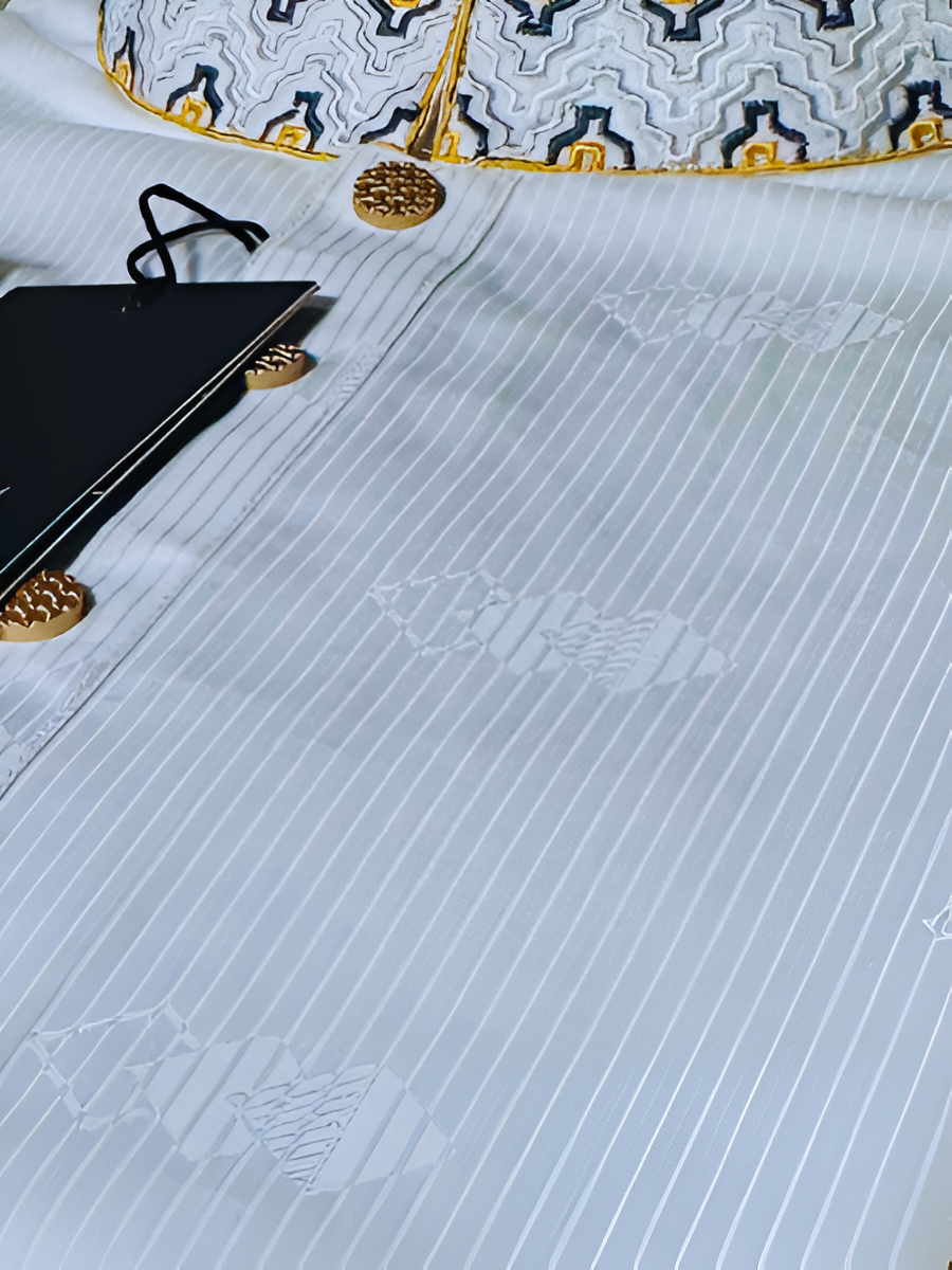 Crafted from Premium Cotton&Blended, this lightweight Semi-fit Panjabi features elegant cuff sleeve and button plate embroidery, adding sophistication to any occasion. Perfect for Eid or special events, it combines comfort with elegance.